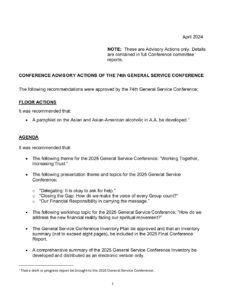 CONFERENCE ADVISORY ACTIONS OF THE 74th GENERAL SERVICE CONFERENCE File Type: pdf Categories: GSC 2024 Tags: GSC2024, GSO Author: GSO
