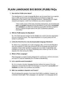 PLAIN LANGUAGE BIG BOOK (PLBB) FAQs PLBB FAQs 2024-EN (1) File Type: pdf Categories: 2024 GSO Communication Tags: 2024, big book, GSO, plain language, PLBB Author: GSO