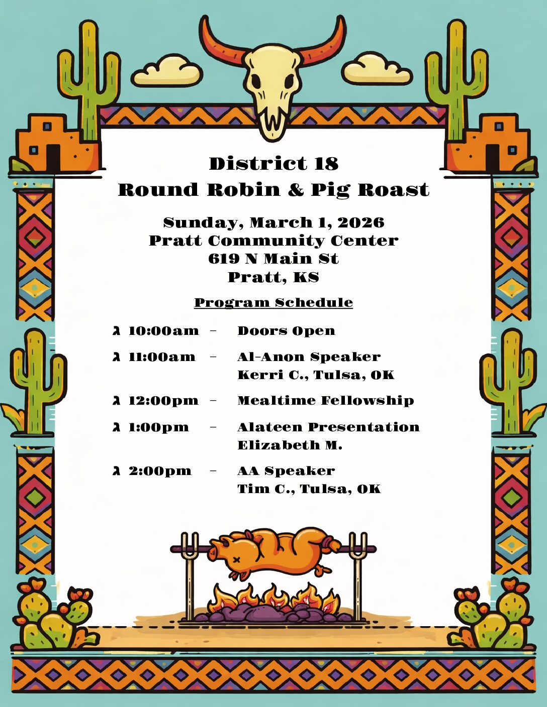 Program Schedule: 10:00am – Doors Open 11:00am – Al-Anon Speaker - Kerri C., Tulsa, OK 12:00pm – Mealtime Fellowship 1:00pm – Alateen Presentation - Elizabeth M. 2:00pm – AA Speaker - Tim C., Tulsa, OK