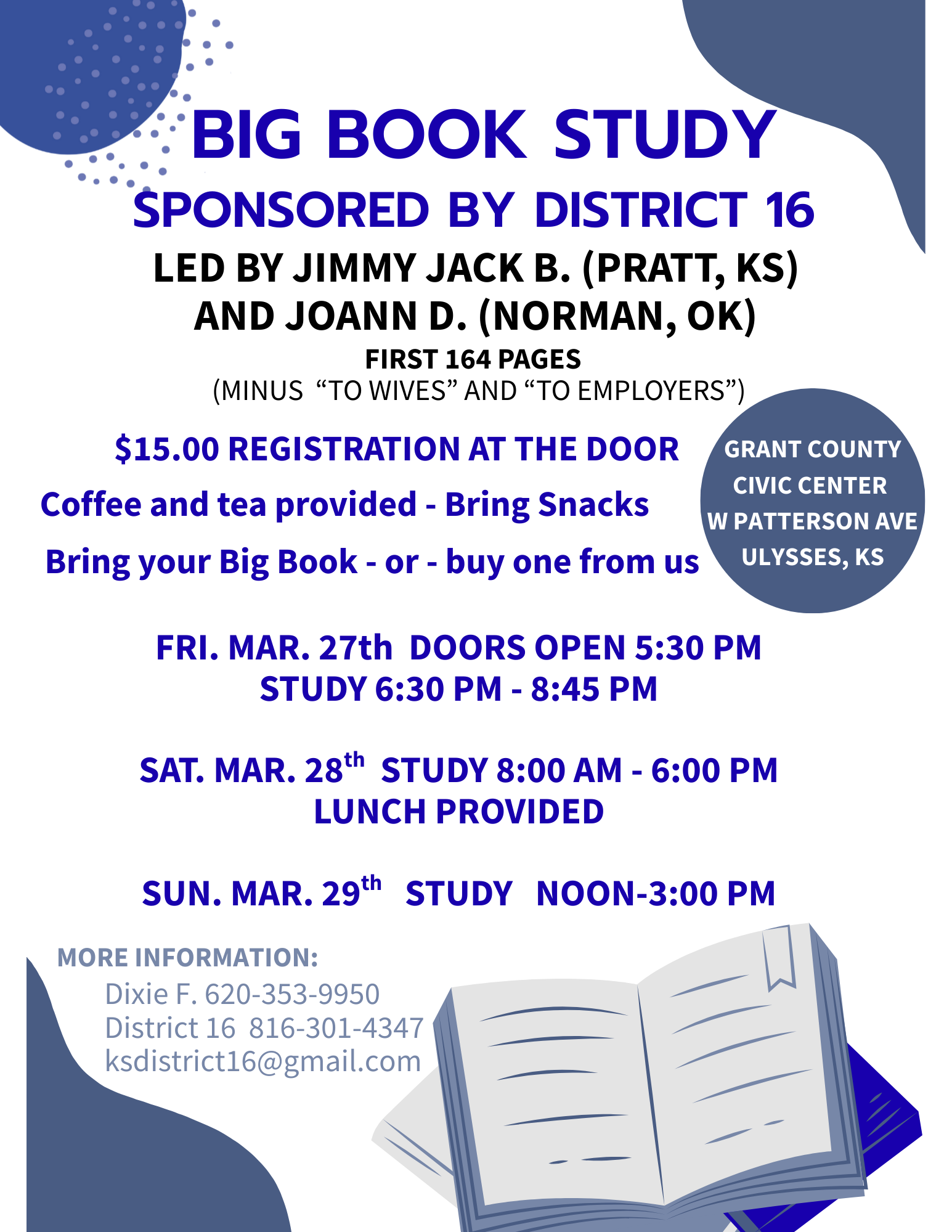 Big Book Study Sponsored By District 16 Led By Jimmy Jack B. and Joann D. First 164 pages (Minus "To The Wives" and "To Employers") $15 Registration at the Door Coffee and Tea Provided - Bring Snacks Bring your Big Book or buy one from us Friday March 27th Doors Open at 5:30pm, Study 6:30pm …