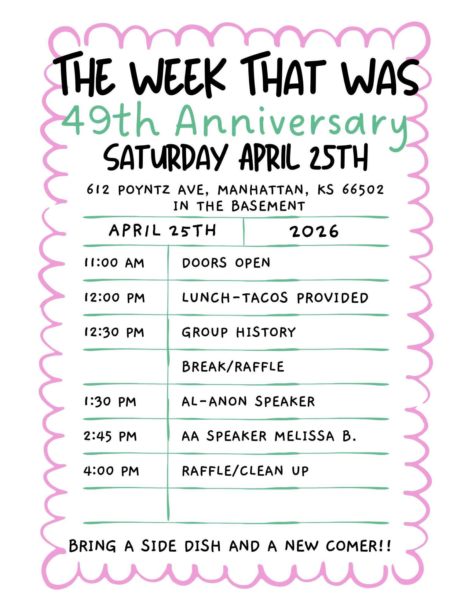 Doors open at 5pm Meal at 5:30pm Taped speaker at 6:30 Featuring a Mexican Potluck Table service and drinks provided. Being a favorite dish or dessert Family friendly!