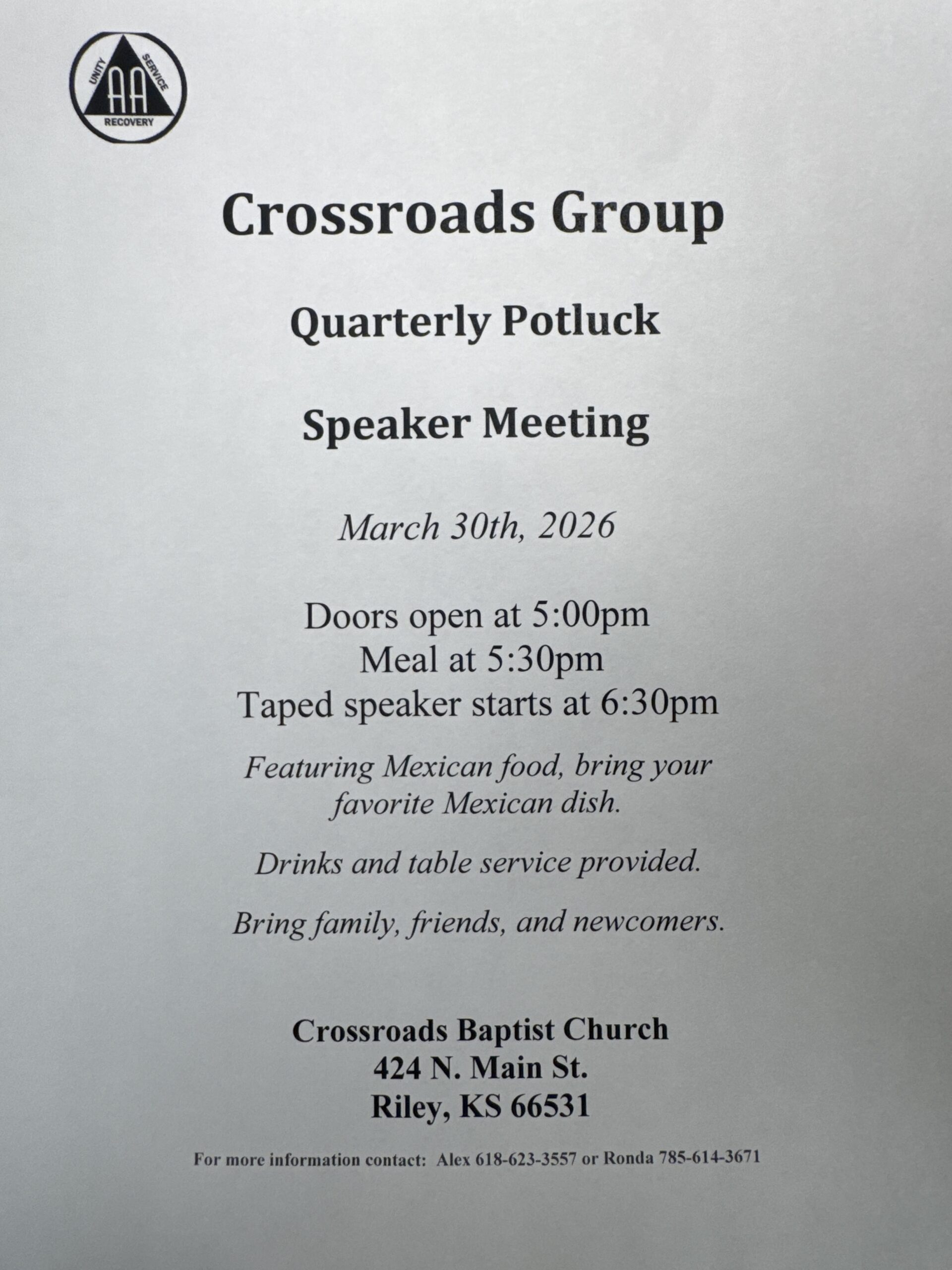 Doors open at 5pm Meal at 5:30pm Taped speaker at 6:30 Featuring a Mexican Potluck Table service and drinks provided. Being a favorite dish or dessert Family friendly! |