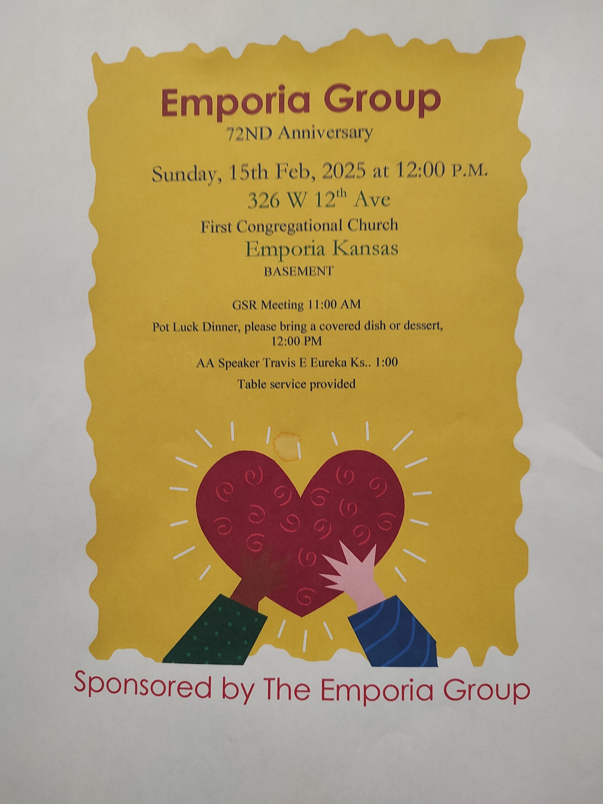 Come share in fellowship as the Emporia Group celebrates their 72nd anniversary! A new venue this year, the basement of the First Congregational Church of Emporia. 326 W 12th Ave, Emporia, KS 66801 Plenty of parking northeast of the church, immediately behind the credit union. Entrance on the northeast corner of the building.